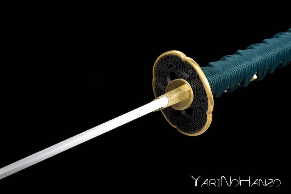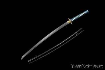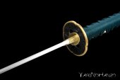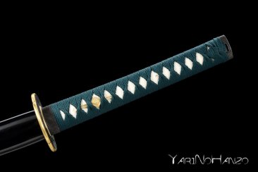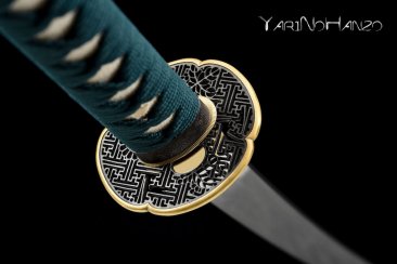 L'impugnatura presenta un tsukamaki alternato con hishigami, avvolto in cotone "Nando" verde acqua, che assicura una presa salda e duratura anche durante sessioni di allenamento intensivo. La tsuba in stile Mokko a tema Sayagata completa l'estetica tradizionale della spada.
