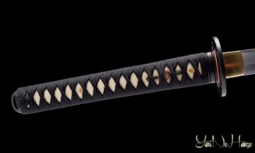 L’impugnatura (tsuka) è realizzata secondo i più alti standard qualitativi: rivestita con tsuka ito in cotone di alta qualità, montata con tsukamaki alternato e hishigami, per garantire una presa salda, sicura e duratura nel tempo. Il rivestimento in vera pelle di razza (samegawa) assicura autenticità e aderenza professionale, mentre il koshirae è ispirato allo stile classico Higo, noto per la sua sobrietà, eleganza e funzionalità marziale.