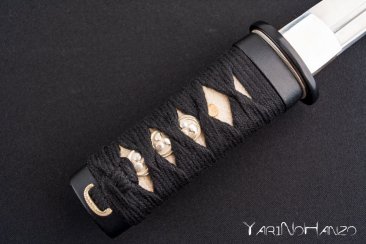 - SAYA IN LEGNO LACCATO NERO, TSUKA ITO IN COTONE NERO (TSUKAMAKI ALTERNATO), SAMEGAWA (PELLE DI RAZZA) BIANCA E TSUBA IN FERRO