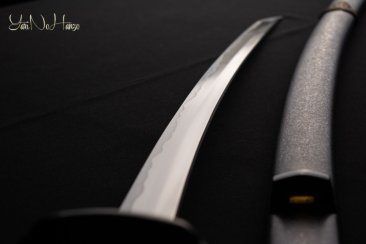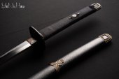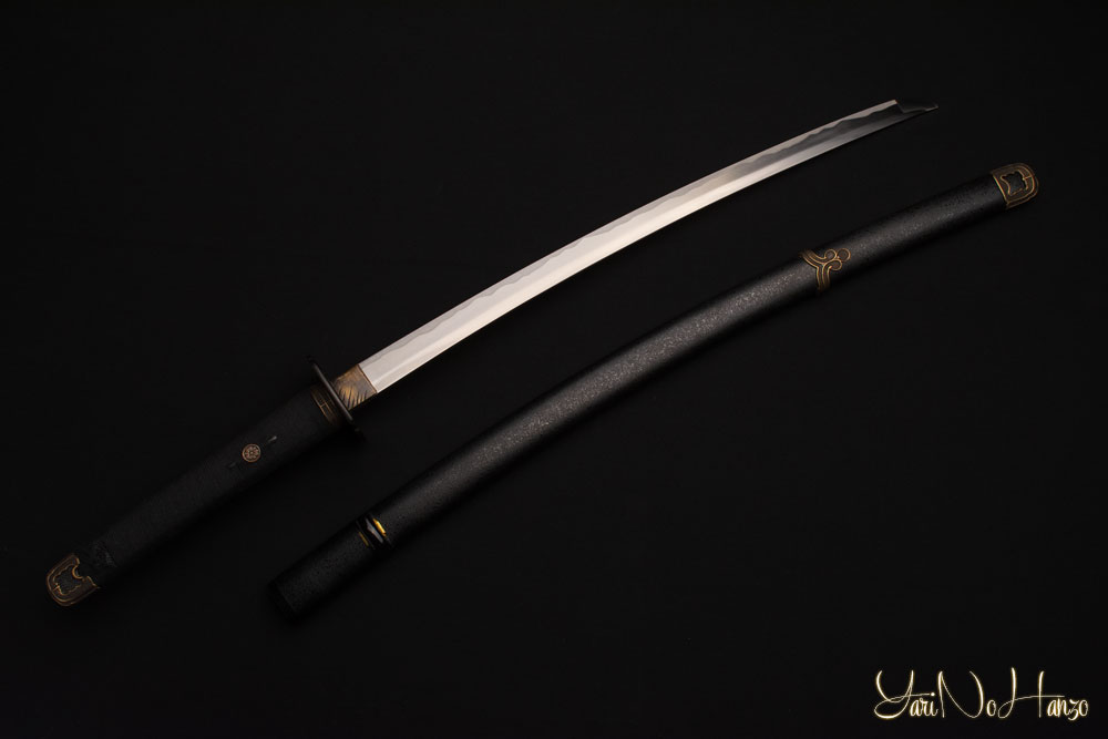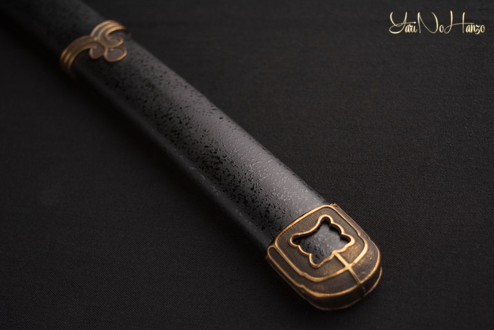 Il koshirae è di tipo Handachi, classico ed elegante, con dettagli in metallo brunito che arricchiscono l’estetica complessiva della spada. La saya, in legno laccato nero opaco, è rifinita con semegane e sayajiri in metallo per garantire robustezza e uno stile tradizionale e discreto. La spada è fornita senza sageo per offrire libertà di personalizzazione al praticante.